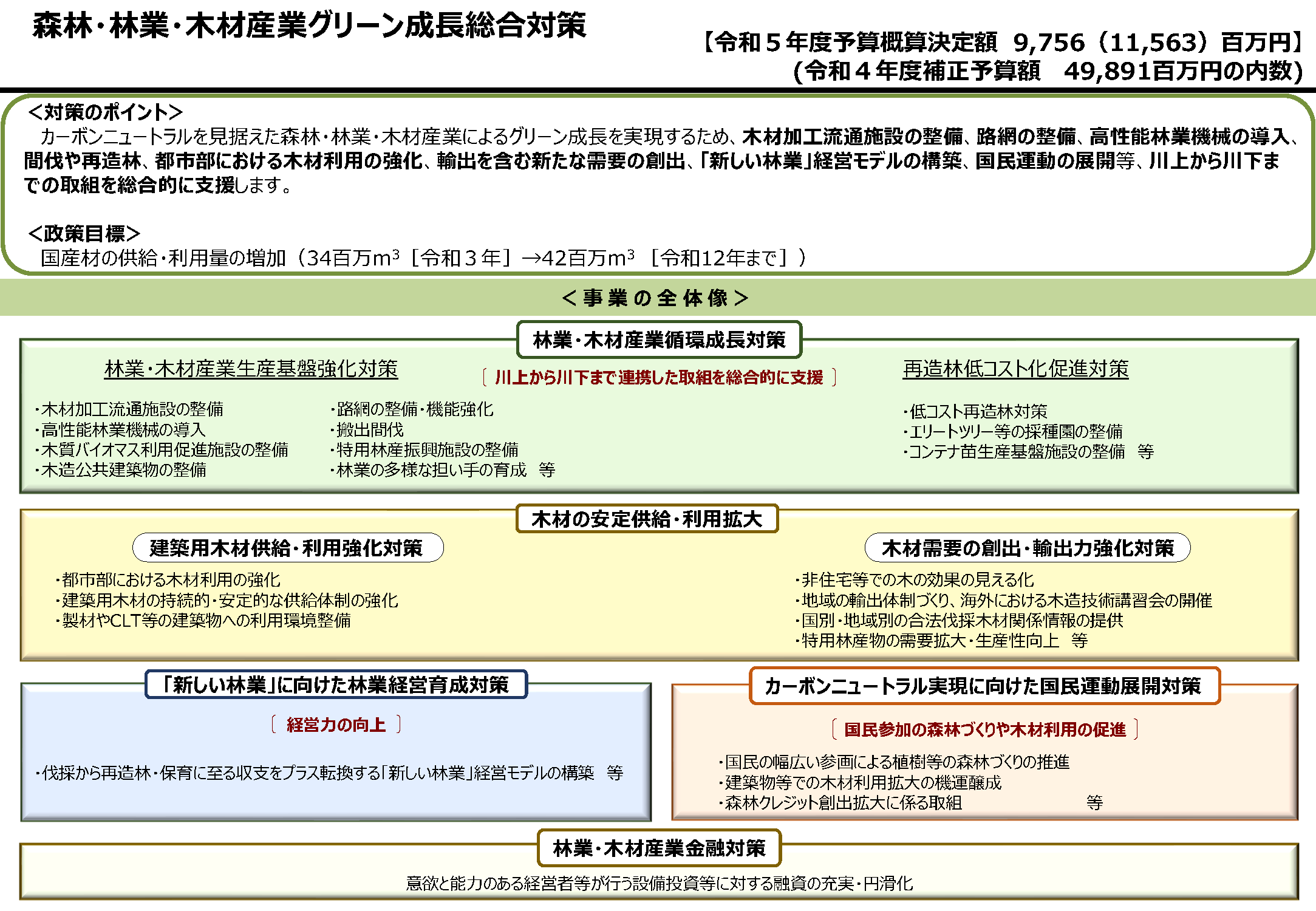 事業概要 趣旨 我が国の森林が人工林を主体に利用期を迎えている中、この豊富な森林資源を活かして木材需要の拡大及びそれによる林業・木材産業の成長産業化を図っていくことが重要であり、これに向けて、これまで木材利用が低位であった都市部や非住宅分野において木材利用を高めるための取組を進めていくことが必要となっています。 このため、建築物における木材利用の促進に向けて、林野庁補助事業による建築用木材に係る技術開発や、建築物への利用実証の取組をまとめています。 予算の概要