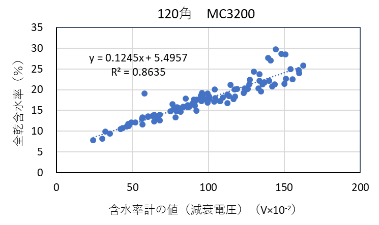 ![]() 図3-4 検量線作成用試験体の各切片に対する含水率計(MC-3200EX)の値と全乾法による含水率の関係(スギ120角) |