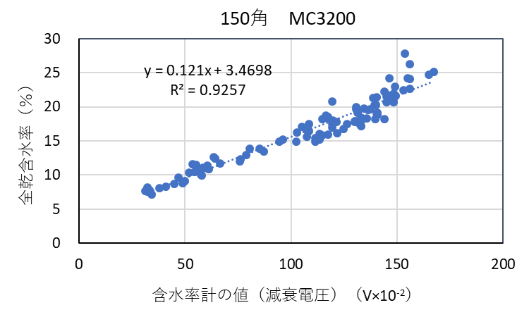 ![]() 図3-6 検量線作成用試験体の各切片に対する含水率計(MC-3200EX)の値と全乾法による含水率の関係(スギ150角) |