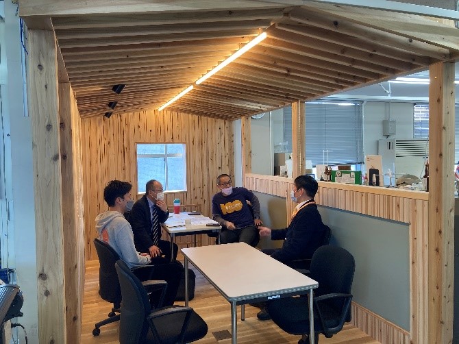 大館市では、森林経営管理制度の施行に伴う森林所有者への森林の経営管理に関する意向調査の実施により、森林所有者の来庁機会が増加していることから、秋田スギが活用された打合せスペースを試作し、協議会事務局(大館市役所三ノ丸庁舎)へ設置、当該スペースでの面談により、木材のPRを図るだけでなく、森林所有者自らの森林整備等への意識向上につなげることを目指します。また、WEB会議システムによるオンライン打合せの機会が増加する一方で、パーソナルスペースが少ないことから、秋田スギ・DLT活用によるWEB会議専用ブースを試作します。同庁舎には観光まちづくり法人が入居しており、観光関連企業の来庁機会も多いことから、観光面での秋田スギPRにより交流人口の拡大を目指します。