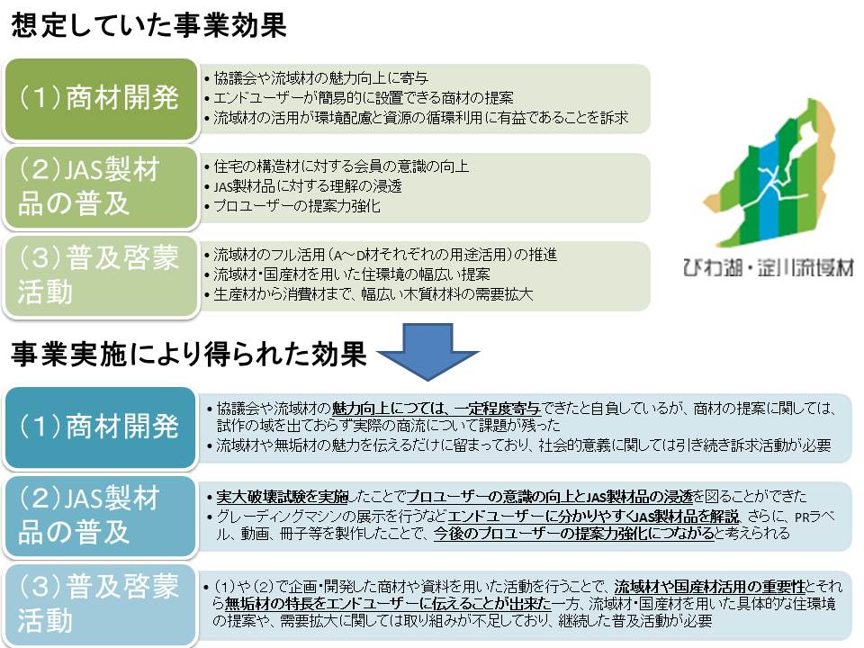 当協議会では、次年度以降も流域全体の繋がりを拡大することで、産業や地域交流が盛んになり、地域経済の活性化に寄与できるような活動を展開する予定である。加えて、消費地の工務店が多数参加している協議会という組織力を活かし、会員が社会的貢献度の高い流域材、JAS製材品を使うことで、他社との差別化を図り、流域材のブランド化推進とその需要拡大に貢献したいと考えている。