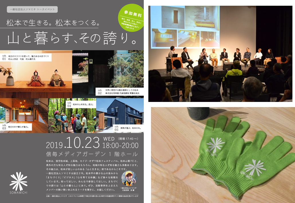 信州松本平で山の恵みとともに暮らすことの意義を伝えるトークイベントや、森林ツアー、木とともにあるライフスタイルを表現する製品展示、またパンフレットなどの理念反響ツールにより、ストーリーおよび理念にもとづいたライフスタイル提案をすることで、「顔の見える関係性」を創出する。ソマミチのファンを増やして五感を通じた体験とコミュニティを継続的につくりだすことで、理念と哲学の反響による「木を使う社会の仕組み」の波及を目指す。とくに林業から、製材加工、設計士、家具製作、指物師、まちづくりディレクターまでいる顔ぶれ豊かなソマミチメンバーによるトータルライフスタイルデザインにより、ネイチャー好きな層へのアプローチおよびリーチを狙う。事業内容・結果(事業項目ごとに具体的に記載)