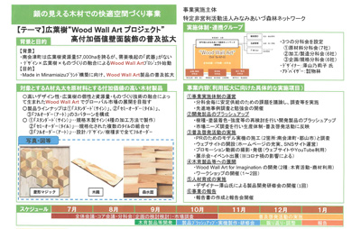 本事業では、「デザイン性」×「多種多様な広葉樹」×「ものづくり技術」の融合による壁面装飾Wood Wall Artの普及拡大を目的とします。